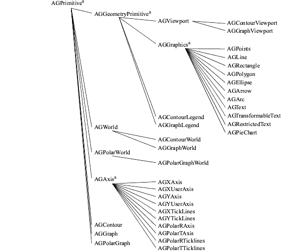Chapter 1 contains a summary of all the objects in the AG Kit that you can select from the Annotation and Graphing page in the Network Editor. The following figure shows the structural relationship between the group objects, depicted by an inheritance tree. A superscripted "a" denotes internal objects that you should not instance.