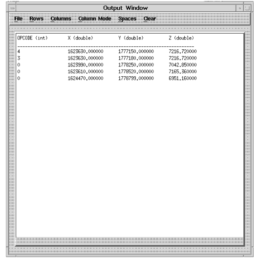 The Output window is used only by the Query interface. The following figure illustrates an Output window containing some data returned by a simple query (the contents of a given Output window will vary depending on the query specifications).