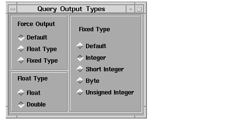 The Query Output Types window is used only by the Query interface. It is provided by the OutputUI macro, which is available for use in other applications; see the on-line help.