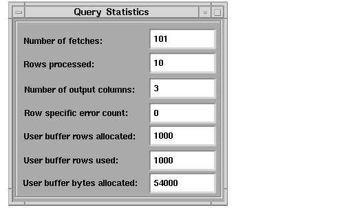 The Query Statistics window is used only by the Query interface. It contains statistics about the most recent fetch operation of the current query: