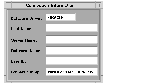 The values in this window are obtained from the various fields of the connect_information parameter of the relevant underlying Database Kit module.