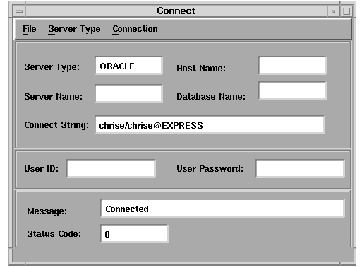 The Connect interface contains a number of input fields into which you enter connect values. If you plan to use a connect string, you should use the Connect String input field; otherwise, you must supply the elements from which to construct a connect string in the other fields.