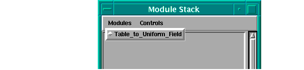 5. A window called Module Stack appears to the left side of the Network Editor. Although the Module Stack window is currently empty, it is through this window that you access the user interface for visualization objects. For example, Read_Field, one of the visualization objects you will be using in this tutorial, reads an AVS/Express field data file. The user interface for Read Field is a file selection dialog, which you will access through the Module Stack window.
