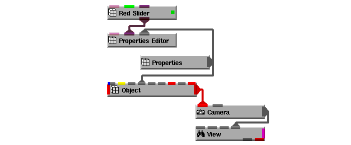 This change causes AVS/Express to activate the properties editor. The properties editor determines which of its subobjectes has changed and updates the properties base type that is attached. In this case, since the value of red has changed, the color subobject of the properties base type is updated.