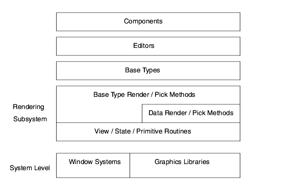 The view base type can be considered the "root" since all other base types either connect to the view or to a child of the view. Subobjects of the view include the type of renderer (e.g., software, OpenGL), the double buffer flag, and background color. Children of the view include a handle to the parent user interface widget, a virtual palette, light information, an array of cameras, and pick control information.