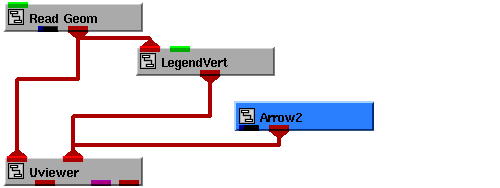 The DataViewer instanced as part of the Accel2DGlyph network contains a 3D map of the Caribbean ($XP_ROOT/data/geoms/carib.geo, read in via the Read_Field module), and an instance of a simple 2D arrow (Templates.GEOMS.Arrow2). (There is also a legend for the map, but this is can be ignored for the purposes of this tutorial.)