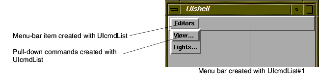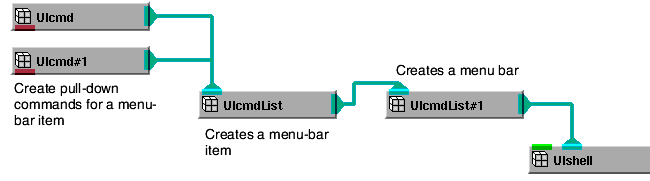 This is just one of many possible configurations. For example, you can connect multiple UIcmdList objects to the UIcmdList that creates the menu bar. This gives you a menu bar with multiple items on it. You can use other UI objects in addition to UIcmd. For example, another UIcmdList object creates a cascading pull-down menu. A UIoption object creates a pull-down command that works like an option box.