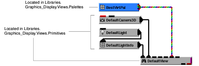 Notice that a Graphics Display Kit object connects to a camera (either DefaultCamera3D or DefaultCamera2D), which in turn connects to a view. You can connect several objects to a camera, and you can connect several 2D and 3D cameras to a view.
