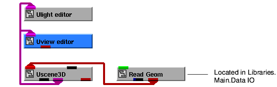 3. Instance Uview_editor and Ulight_editor, then connect them to the other objects, as shown in the diagram below. When the editors are instanced, the UIcmd contained in the editors is automatically installed on the Editors pull-down menu.