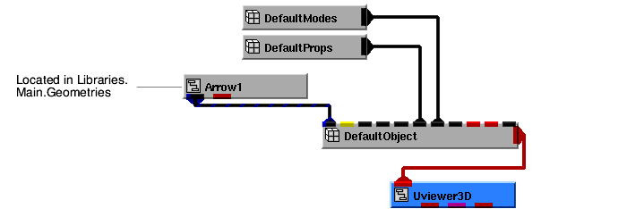 Finally, we need to supply the Graphics Display Kit with an object to render. We can do this with Arrow1. It makes the data available both as a field (first output port) and as a Graphics Display Kit object (second output port), ready for rendering. We use the second output port.