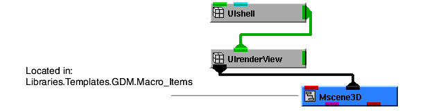 Here is what the definition of a Graphics Display Kit object looks like, at the base-type level. Most of the base types defining a Graphics Display Kit object are optional. In the diagram, the object is connected into Uviewer3D, a macro that defines a full-featured renderer, including a view and a rendering window.