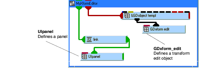7. Connect the three UIsliders to GDxform_edit, as shown in the followoung diagram. Note that objects in the diagram have been shifted to make the connection lines clearer.