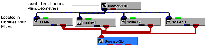 3. Instance Diamond3D and scale (four copies), then connect them together and to UViewer3D, as shown in the diagram below.