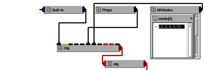 The following diagram, which shows how to do this, is taken from the AttribAltObj example that is found in Libraries.Examples.Graphics_Display. To see the objects shown in the network, maximize Read_Geom, maximize DataObject, maximize AltObject. Open AltModes, then open mode[5].