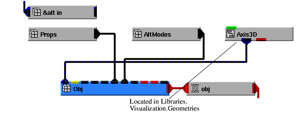 The following diagram, which shows how to do this, is taken from the Bound1AltObj example that is found in Libraries.Examples.Graphics_Display. To see the objects shown in the network, maximize Read_Geom, maximize DataObject, maximize AltObject. Open AltModes, then open mode[5].