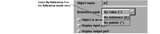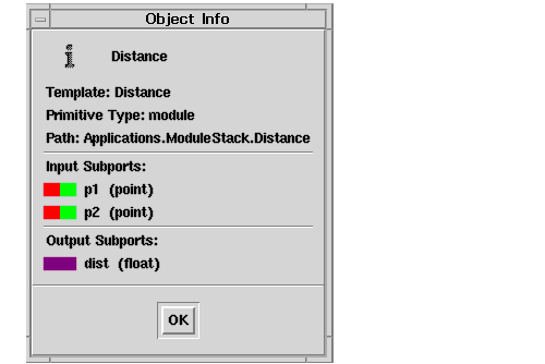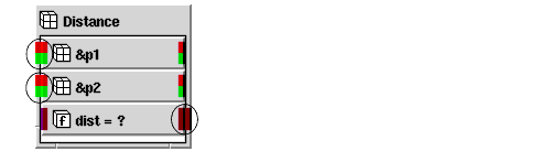 For the Distance module, you want input parameters p1 and p2 to get their values through connections to other objects. This is called by-reference mode. You will see the effects of reference mode later, when you use Distance in an application.