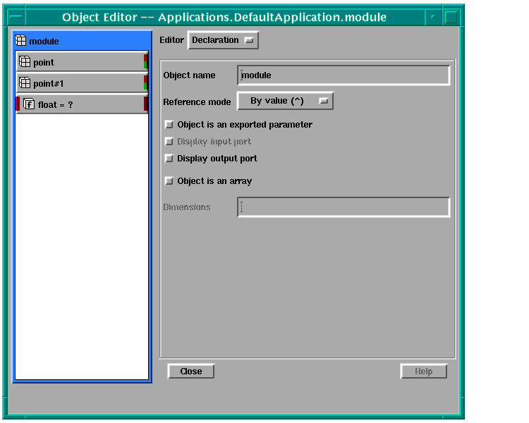 AVS/Express displays the Object Editor for module: