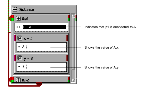 Notice that p1.x, inside Distance, reflects the new value of the object to which it is connected.