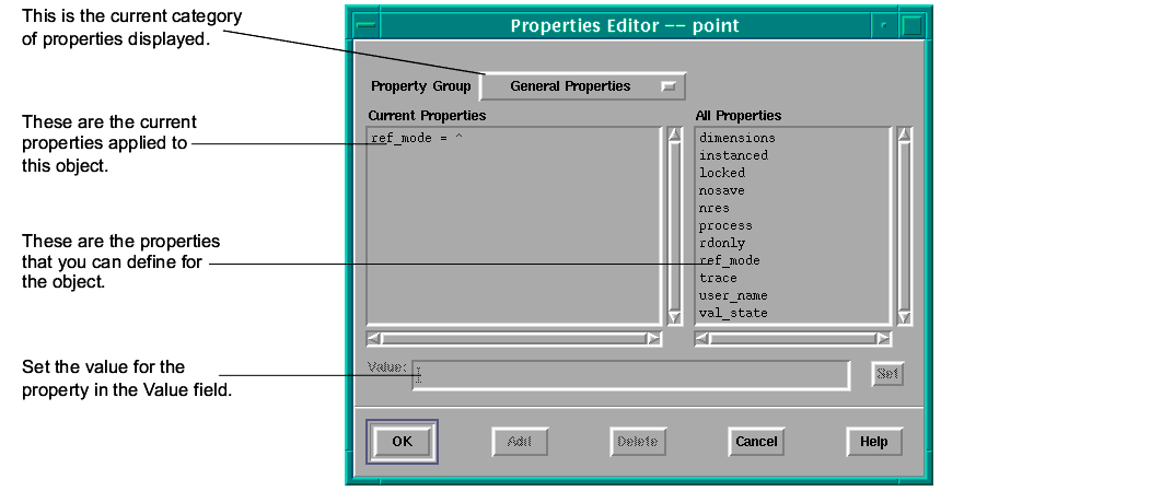 You set a characteristic by moving it from All Properties to Current Properties, then setting its value in the Value field at the bottom of the dialog.