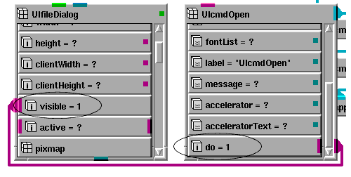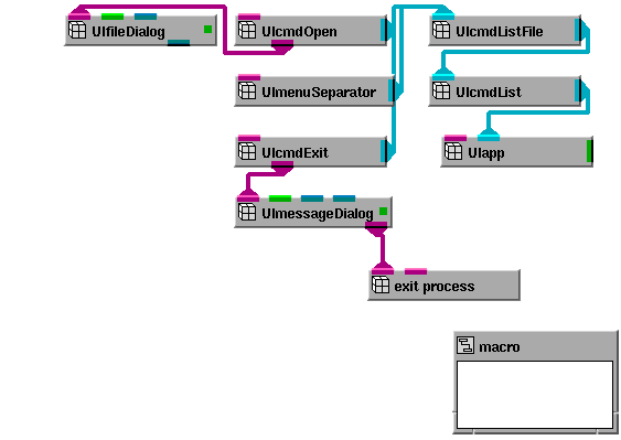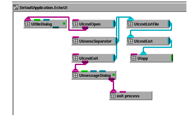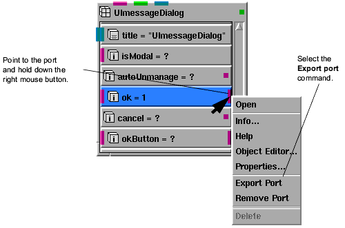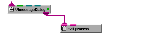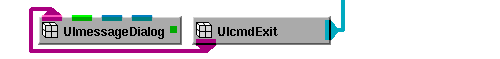 1. Instance UImessageDialog and connect it to UICmdExit, thus exporting the input port for the visible parameter. (Use the same procedure as you did for UIfileDialog in steps two and three in the last section, Add the Dialog )
