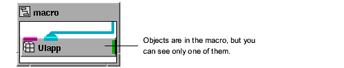 Moving objects from one container object (in this case, DefaultApplication) to another is called reparenting. The objects now have a new parent object, the macro.