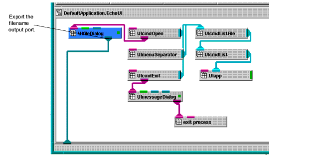 8. Export UIfileDialog's output port and to the outside of the EchoUI macro. This makes the filename parameter, a string containing the filename selected in the file dialog, accessible to other object outside the macro.