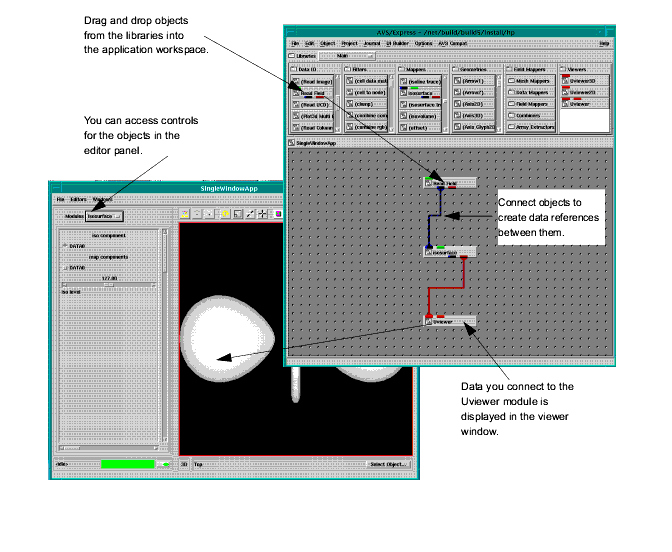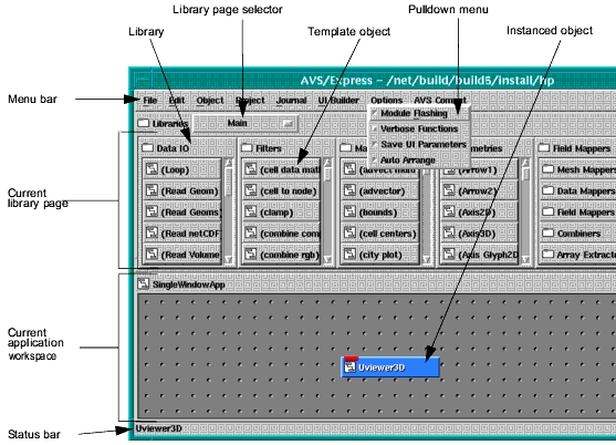 The bottom section of the Network Editor displays the current application workspace. You build your application in the workspace by using your mouse to drag template objects from the libraries into the workspace. When you drop the object into an application workspace, AVS/Express creates a copy of the template, called an instance. An instanced object is active, that is, AVS/Express executes the methods in the object. You can reference data between instanced objects by using your mouse in the workspace to draw connections between objects.