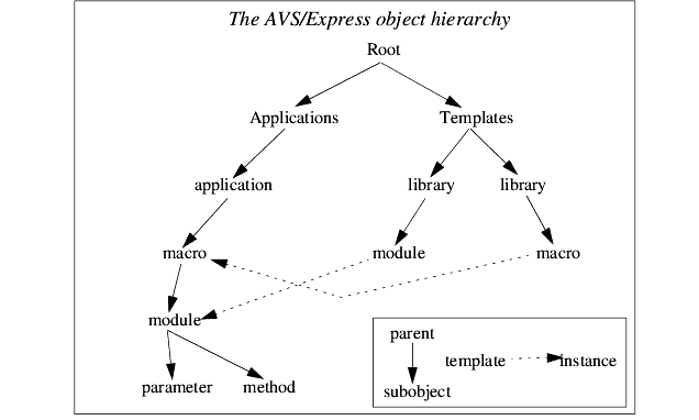 We have defined several different types of AVS/Express objects: macro, module, parameter, method, and library. Each of these objects is a subclass of a common object type called simply object. These objects are all stored in a single tree structure called the object hierarchy.