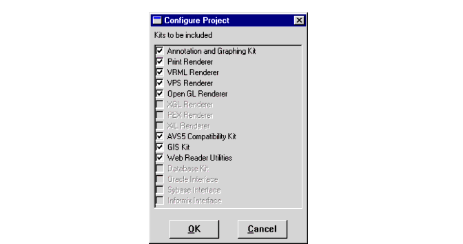 To change the configuration of the libraries saved in your project, select Configure from the Project menu. AVS/Express displays a list of libraries and renderers that you can exclude from your project: