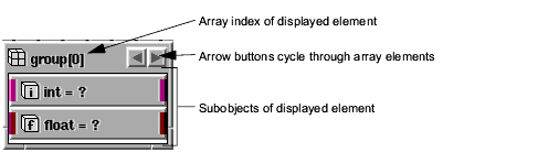 You can access individual elements in an array of groups. When an array of groups is open, it displays the subobjects of one element at a time. You can traverse the elements using arrow buttons in the object's title bar: