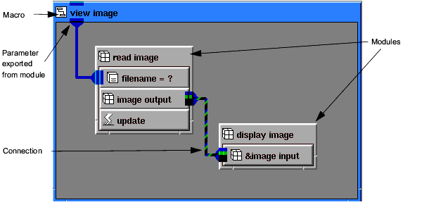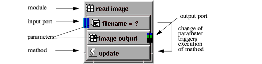 The connections between objects in the Network Editor are connections between parameters. A connection provides a conduit for the sharing of information between two objects. The methods in an AVS/Express execute in response to events that occur on the parameters of the object. Objects can send messages back and forth across connections to other objects without your needing to manage this communication explicitly. Thus you do not have to know of the existence of the methods and do not need to manage the execution of the object. This is called execution encapsulation. In AVS/Express objects that have parameters and methods and have their execution encapsulated are called modules.