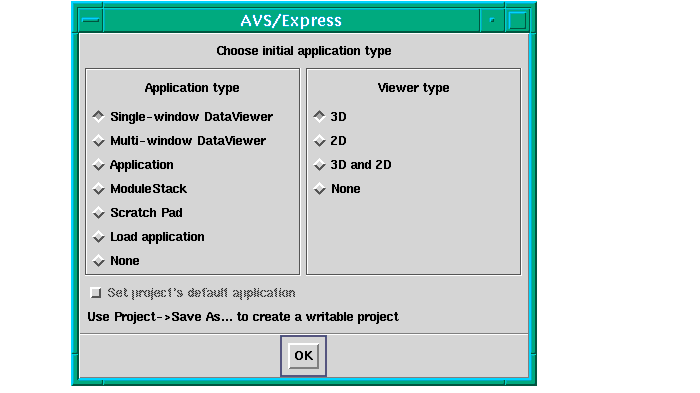 To enable this choice as the default, you must save the current session in a project file before exiting, When you start AVS/Express again using this project, the Network Editor loads your choice of application as the default and does not display the start-up dialog.