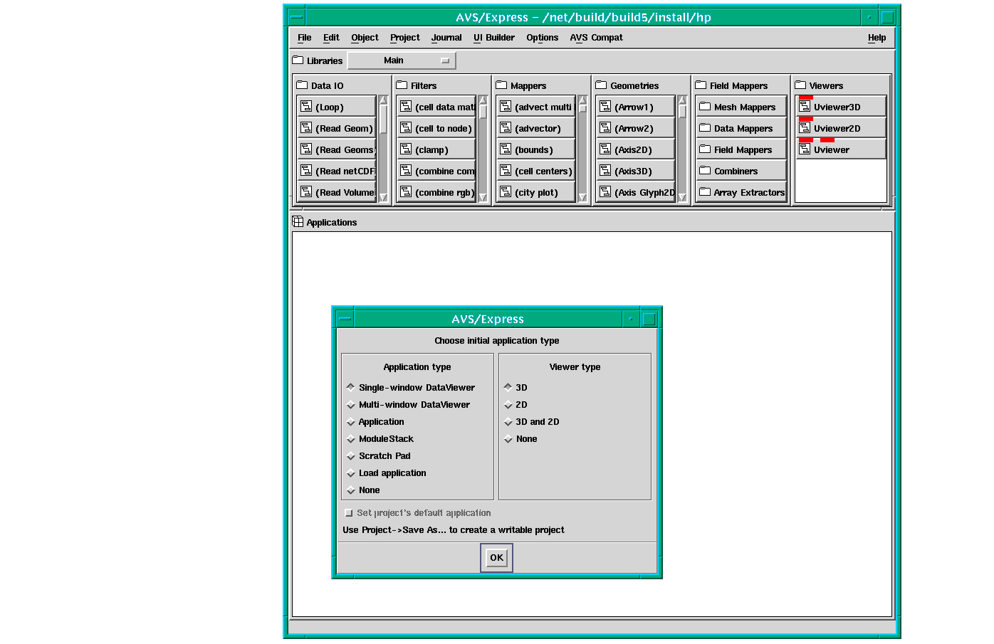 If you select None, AVS/Express starts-up with the root Applications object in the workspace. The Applications object is the ancestor of all applications in AVS/Express. You can instance a template application from a library into Applications. For example, you might want to instance one of the example applications from the Examples library.