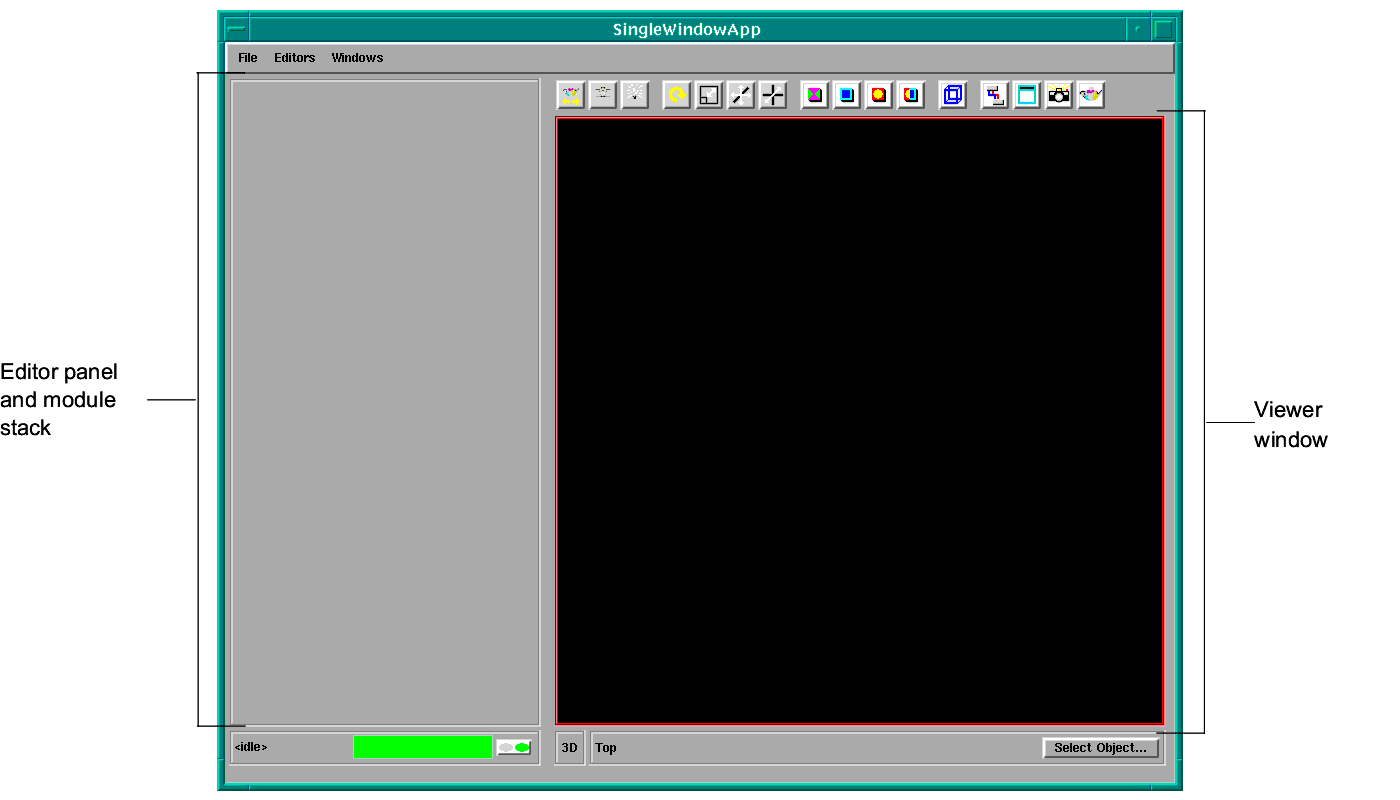 The Single-window DataViewer opens one window that combines a viewer window in which you can display your data or image, and a set of editors that you can use to customize and interact with the viewer configuration: