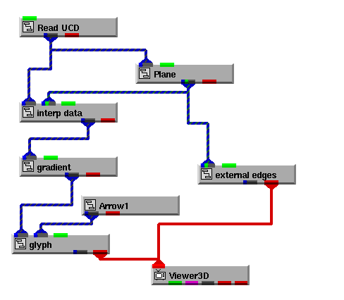 For example, the advector macro that does particle advection is actually a subnetwork composed of a series of hierarchical macros that are in turn composed of the base modules DVstream, DVloop, DVadvect, DVglyph, and various UI widgets.