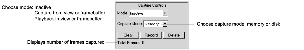 You can also force a frame to be added by clicking the Record button. When you push Record, the current view is recorded in a frame at the end of the current series of captured frames. You can delete the current image by clicking the Delete button, or delete all the saved images by clicking the Clear button. Total Frames displays the number of images currently saved.