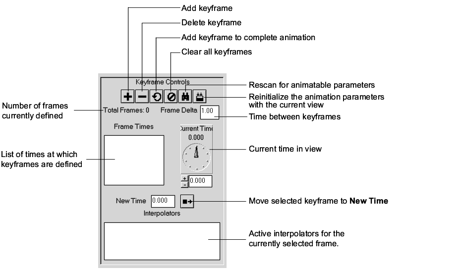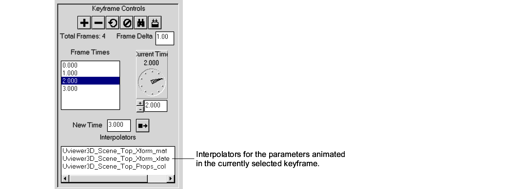 As you add keyframes, the times at which keyframes are defined is displayed in the Frame Times listing. You can display the frame associated with a time by clicking on it in this list. When you select a time from the Frame Times list, the Interpolators listing is also updated to show the interpolators that are active for the corresponding time frame. This tells you which parameters are included in the Viewer animation.