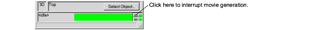 The status bar at the bottom of the Display Editor window displays image capture's progress as the movie is created. Depending on the number of frames you are converting to a movie file and the type of machine you are using, it can take some minutes to generate the movie. You can cancel creation of the movie by clicking the left oval in the execution interrupt toggle at the bottom of the Display Editor window: