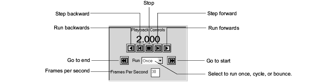 As shown in the illustration above, you can use the buttons on the Playback Controls panel to run or step through the animation in either direction, or to go directly to the beginning or end of the sequence.