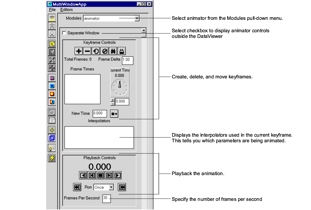 You can select the Separate Window checkbox to display the animator controls in their own window outside the DataViewer panel. This allows you to use the DataViewer editors and other module's controls to create your keyframes while you are building the animation, without having to switch the editor panel back and forth between the DataViewer and animator controls.