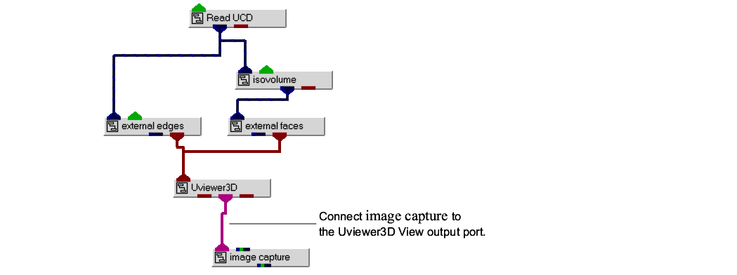 To capture images, instance the image capture module from the Main.DataIO sublibrary into the application workspace in the Network Editor and connect the appropriate image capture input port to either a view, the view port of a Uviewer object or a "framebuffer," the field output port of a filter or other object that produces a 2D image field. For example, the following diagram shows the image capture routine added to the network for the Isovolume example found in the Examples.Visualization sublibrary: