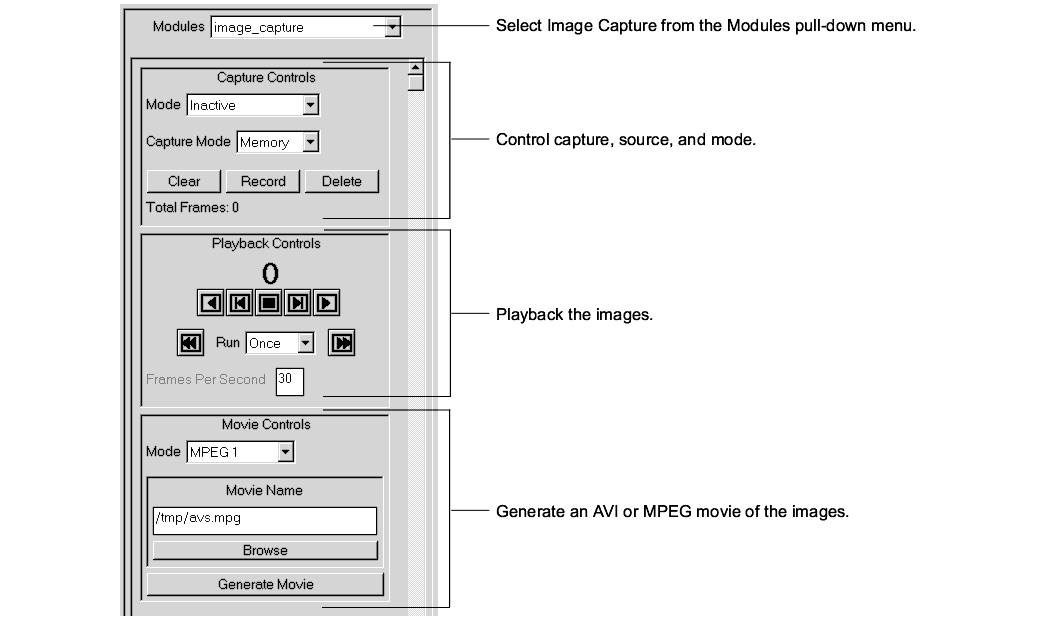 You use the Capture Controls to enable capture and to control how the images are recorded. You can specify whether the module stores the images in your computer's memory or in temporary files on your disk.