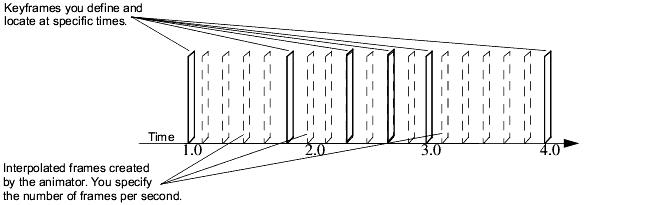 To create a keyframe animation, you create a series of views, the "keyframes," that define known points in the animation you want to produce. The animator then adds frames between the keyframes to produce an animated sequence. These new frames are created by interpolating parameters of the view, such as size, position, or color, from one keyframe to the next. You control the number of frames that are created by specifying the number of frames per second for the animation. The following illustration shows the relationship between keyframes and interpolated frames.