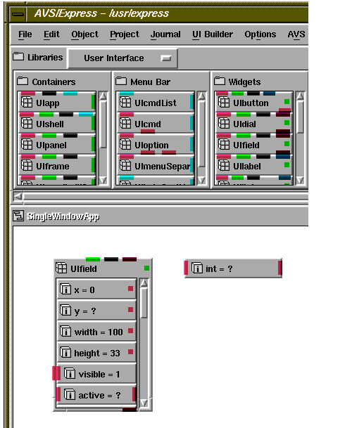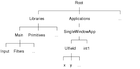 The figure below illustrates a portion of the object hierarchy. Assume for this example that the current application is SingleWindowApp and that you have instanced two objects in it, UIfield and int1.
