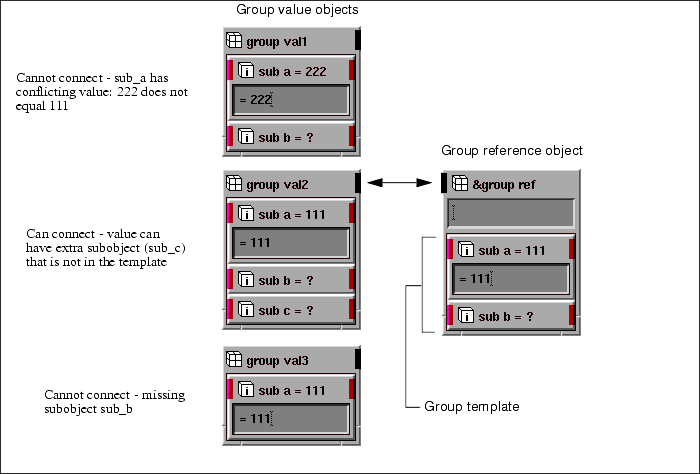 The way assignments and connections work differs between primitive data objects and groups, modules, and macros: