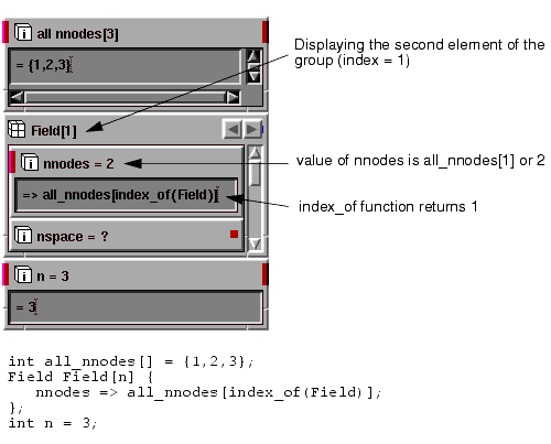 The object outside of the array can reference a subobject of the group with a constant index in its value expression. For example, to connect a value from outside of the array to the nspace subobject of the second element in the Field array (index 1) you place this value in the value expression: