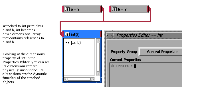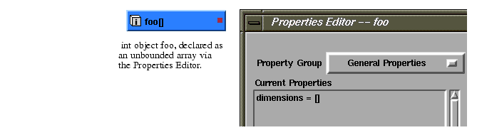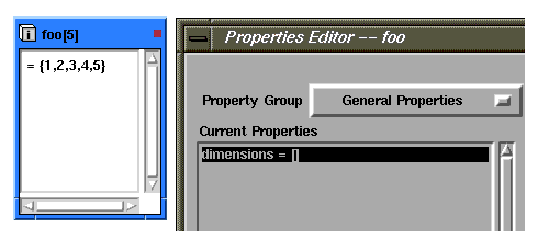 Such an object will automatically take on the dimensions of any array of values placed in foo. For example, if foo is set to equal {1,2,3,4,5}, the dimensions of foo will dynamically be set to [5], although the dimensions property is still seen to be unbounded when viewed in the Properties Editor.