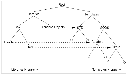Instead, the Network Editor displays another object defined as a child of Root called Libraries which contains a set of links into the Templates hierarchy. This structure allows the libraries in Templates to be given more readable names, and for their order to be rearranged. This structure is shown in the following diagram: