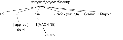 For all uses of the compiled project capability, a separate project directory is created that contains local versions of the AVS/Express-generated make and configuration files. This project directory contains a local version of each AVS/Express executable needed by the objects contained in the compiled project.