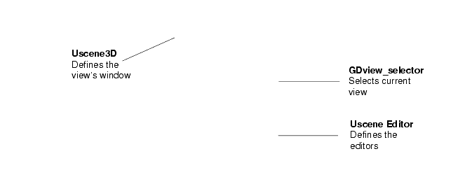 - Instance Uview_editor and Ulight_editor, then connect them to the other objects, as shown in the diagram below. When the editors are instanced, the UIcmd contained in the editors is automatically installed on the Editors pull-down menu.
